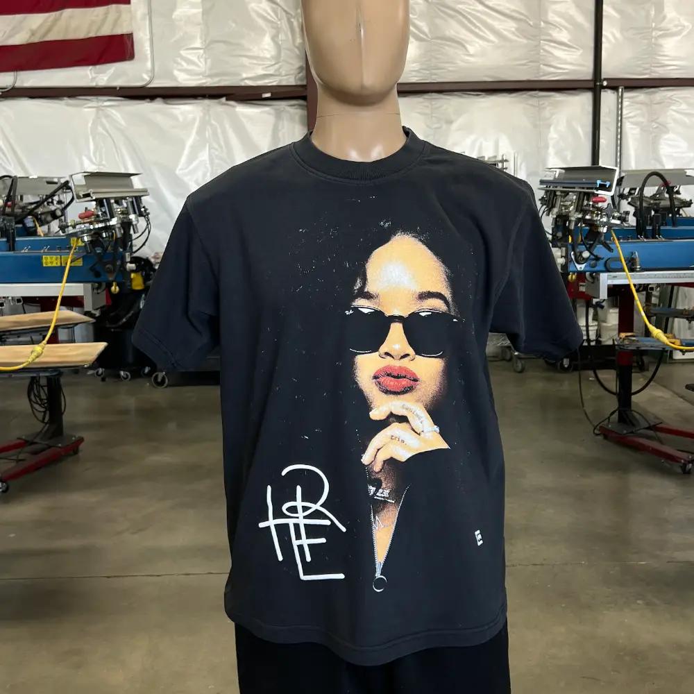 We created these 1,500 custom jumbo screen printed t-shirts in just 48 hours! We used tan, brown, white, and black screen print inks to print the artwork. The client chose the LA Apparel 1801GD, a 6.5 oz heavyweight t-shirt in black, which is a top choice for streetwear brands due to its thick collar, oversized fit, and premium fabric.