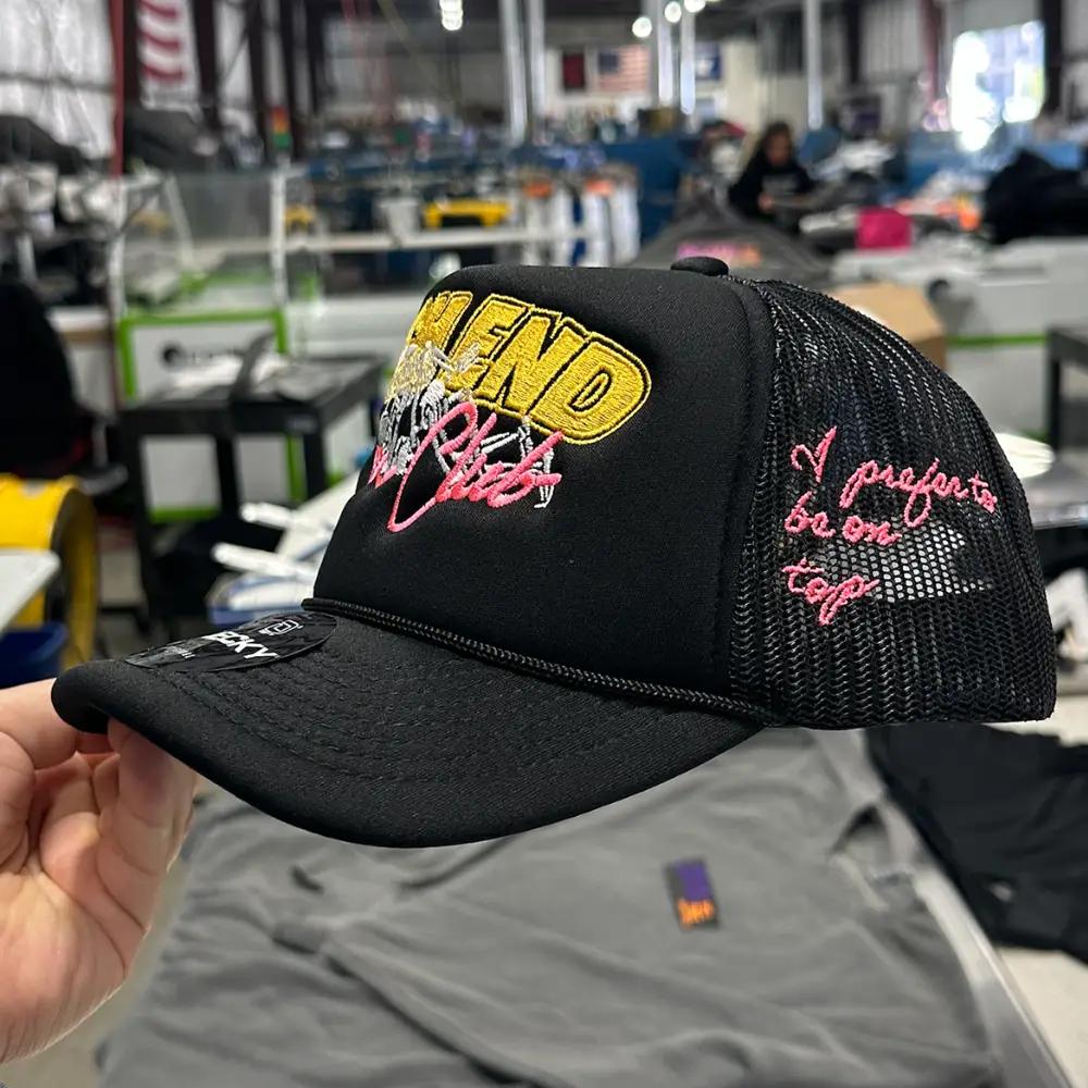 At Garment Decor, we specialize in creating custom embroidered merchandise for clothing brands with precision and high-quality materials. Recently, we embroidered 475 black Decky #211 5 Panel High Profile Structured Foam Trucker Hats, featuring a vibrant multi-color design. The front embroidery used yellow, white, and pink threads, while the side showcased pink text embroidery for a cohesive, eye-catching look.