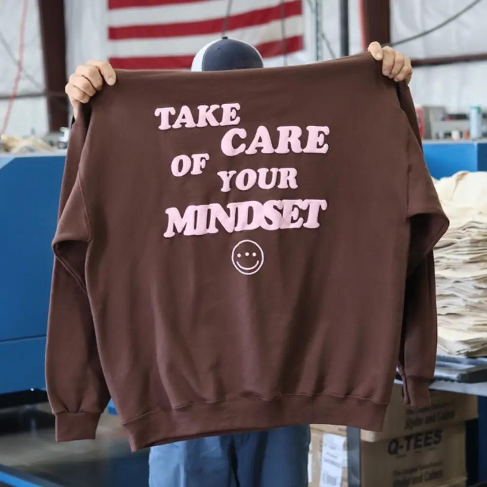 The puff pink ink used on these hoodies creates a raised, textured effect that adds depth to the design, making it stand out against the chocolate-colored fabric. The texture and vibrancy of the puff ink are showcased in the two zoomed-in photos provided, giving customers a close-up look at how their designs can achieve a 3D effect.