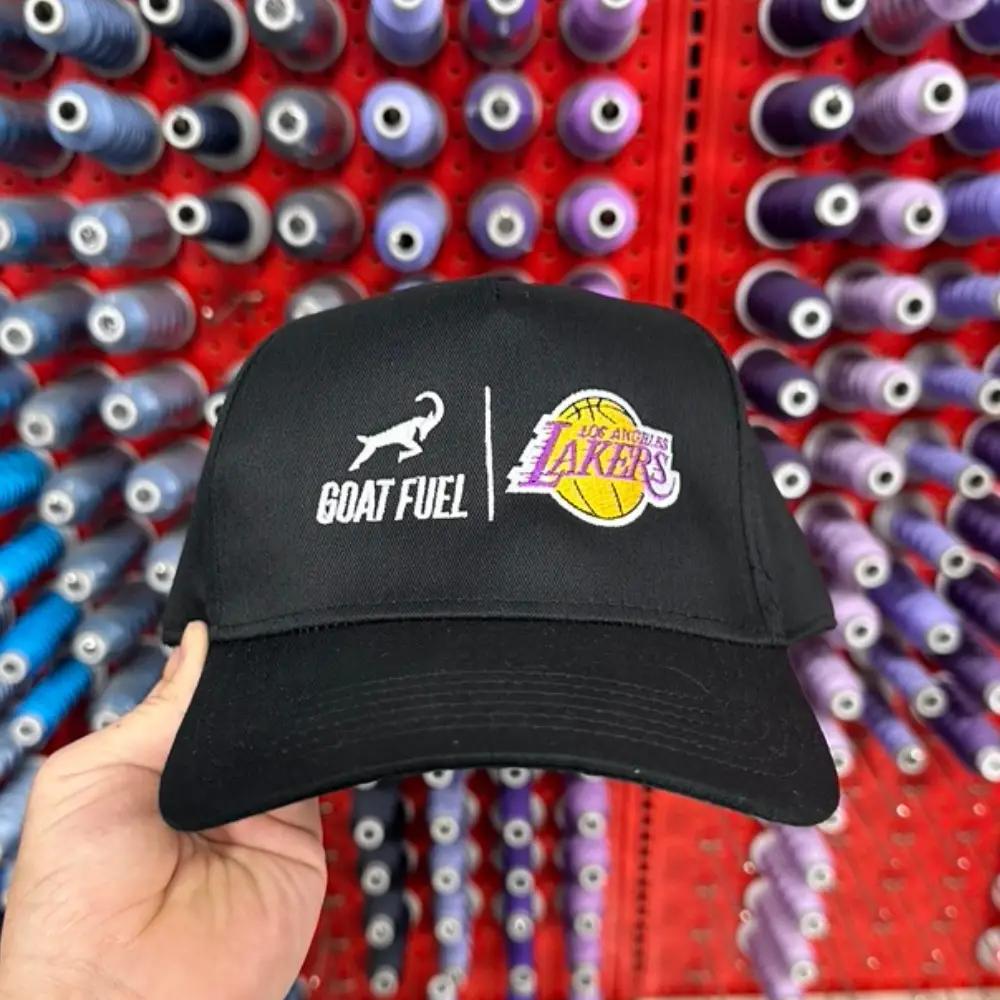 We embroidered the Goat Fuel logo in white, which stands out beautifully on the black background, and the Laker’s logo in its signature purple and gold, maintaining the team’s classic look.